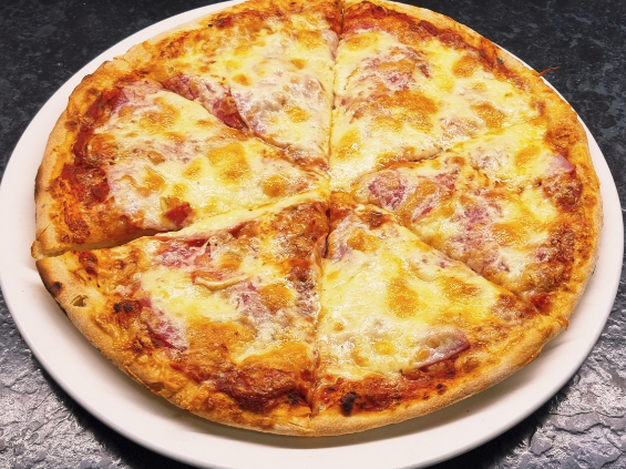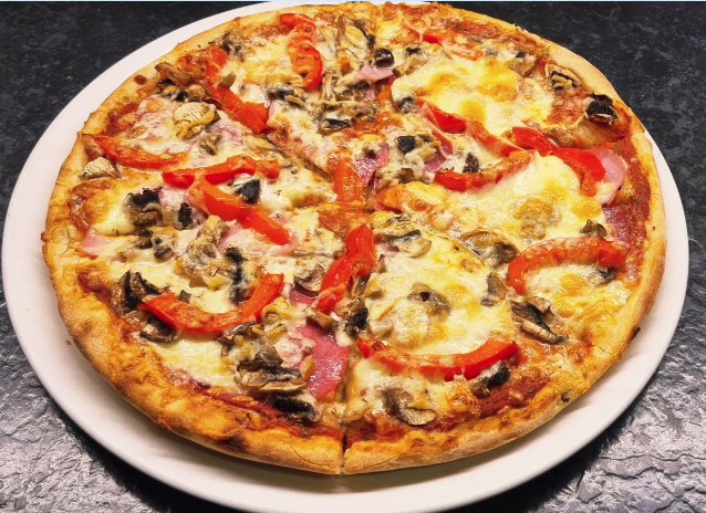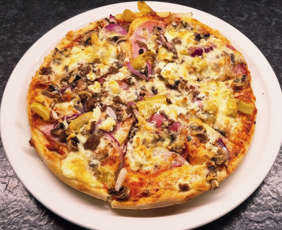Hackfleisch vom Rind, Salami, Schinken, Schafskäse, Champignons, milde Peperoni [1,2,3,7]